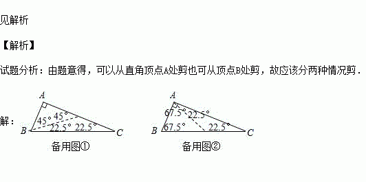(2008•宣武区一模)已知△ABC中,∠A=90°,∠B=67.5°,请画一条直线,把这个三角形分割成两个等腰三角形.(请你选用下面给出的备用图,用两种不同的分割方法画出来.只需画图,不必说明理由,但要在图中标出相等两角的度数)