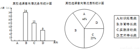 为深化义务教育课程改革,满足学生的个性化学习需求,某校就“学生对知识拓展,体育特长、艺术特长和实践活动四类选课意向”进行了抽样调查(每人选报一类),绘制了如图所示的两幅不完整的统计图,请根据图中信息,解答下列问题:
