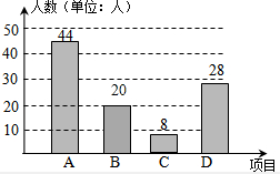 解答 解:(1)样本中喜欢B项目的人数百分比是:1-44%-28%-8%=20%,