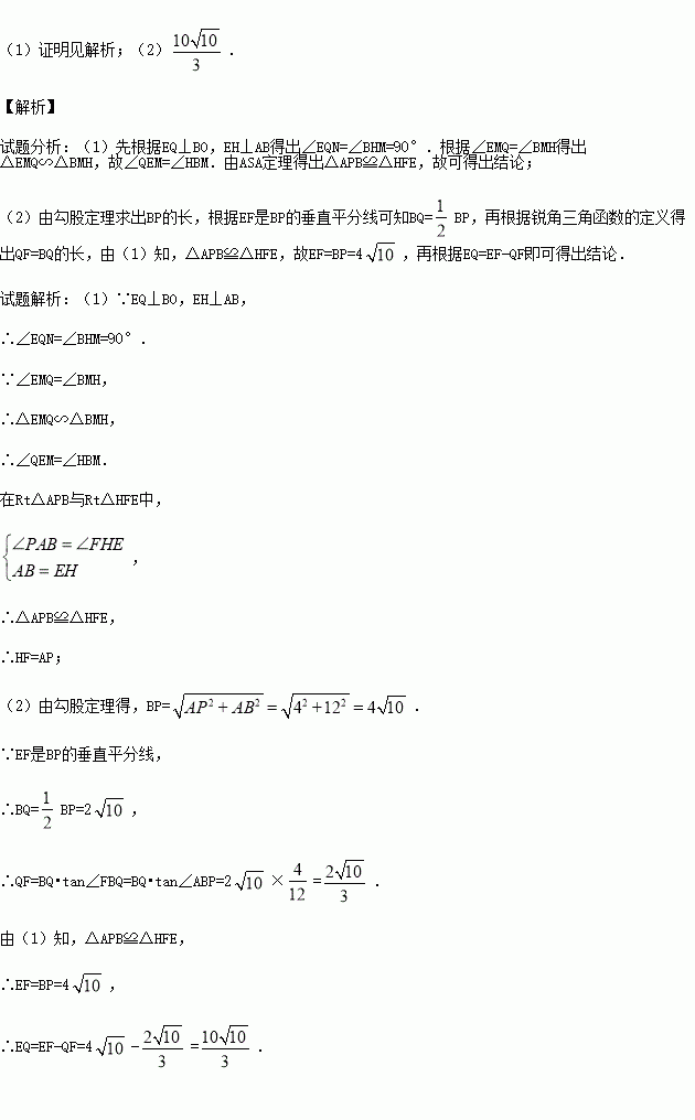 如图,在正方形ABCD中,点P在AD上,且不与A、D重合,BP的垂直平分线分别交CD、AB于E、F两点,垂足为Q,过E作EH⊥AB于H.
