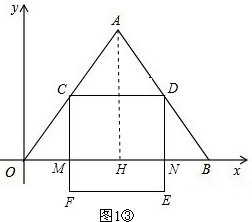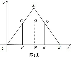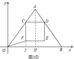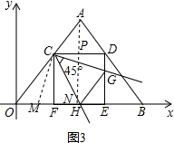 £¨3£©ÔÚxÖáÉϽØÈ¡FM=DG£¬Á¬½ÓCM£¬¸ù¾ÝËıßÐÎCDEFÊÇÕý·½ÐΣ¬µÃµ½CD=CF£¬¡ÏCDE=¡ÏCFE=¡ÏCFM=¡ÏFCD=90¡ã£¬Ö¤³ö¡÷CFM¡Õ¡÷CDG£¬ÓÚÊǵõ½¡ÏDCG=¡ÏMCF£¬CM=CG£¬ÍƳö¡ÏMCH=¡ÏMCF+¡ÏFCH=45¡ã=¡ÏHCG£¬µÃµ½¡÷MCH¡Õ¡÷GCH£¬ÓÚÊǵõ½MH=GH£¬ÓÚÊǵõ½¡÷HEGµÄÖܳ¤=GH+HE+GE=MH+HE+GE=FH+FM+HE+EH=FH+HE+EG+DG=EF+DE=2CD£¬¹ýA×÷AN¡ÍOBÓÚN£¬½»CDÓÚP£¬ÔòON=$\frac{1}{2}$OB=6£¬¸ù¾Ý¹´¹É¶¨ÀíµÃµ½AN=$\sqrt{A{O}^{2}-O{N}^{2}}=\sqrt{1{0}^{2}-{6}^{2}}$=8£¬Í¨¹ý¡÷ACD¡×¡÷AOB£¬ÁбÈÀýʽ¼´¿ÉÇó³ö½á¹û£®