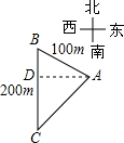 | 如图,陈华同学从学校的东大门A处沿北偏西54°方向走100m到达图书馆B处,再从B处向正南方向走200m到达操场旗杆下C处,计算从旗杆下C到东大门A的距离是多少?(精确到0.1) |