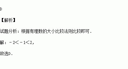 A.﹣2<2<﹣1 B.﹣1<﹣2<2 C.2<﹣1<﹣2 D.﹣2<﹣1<2