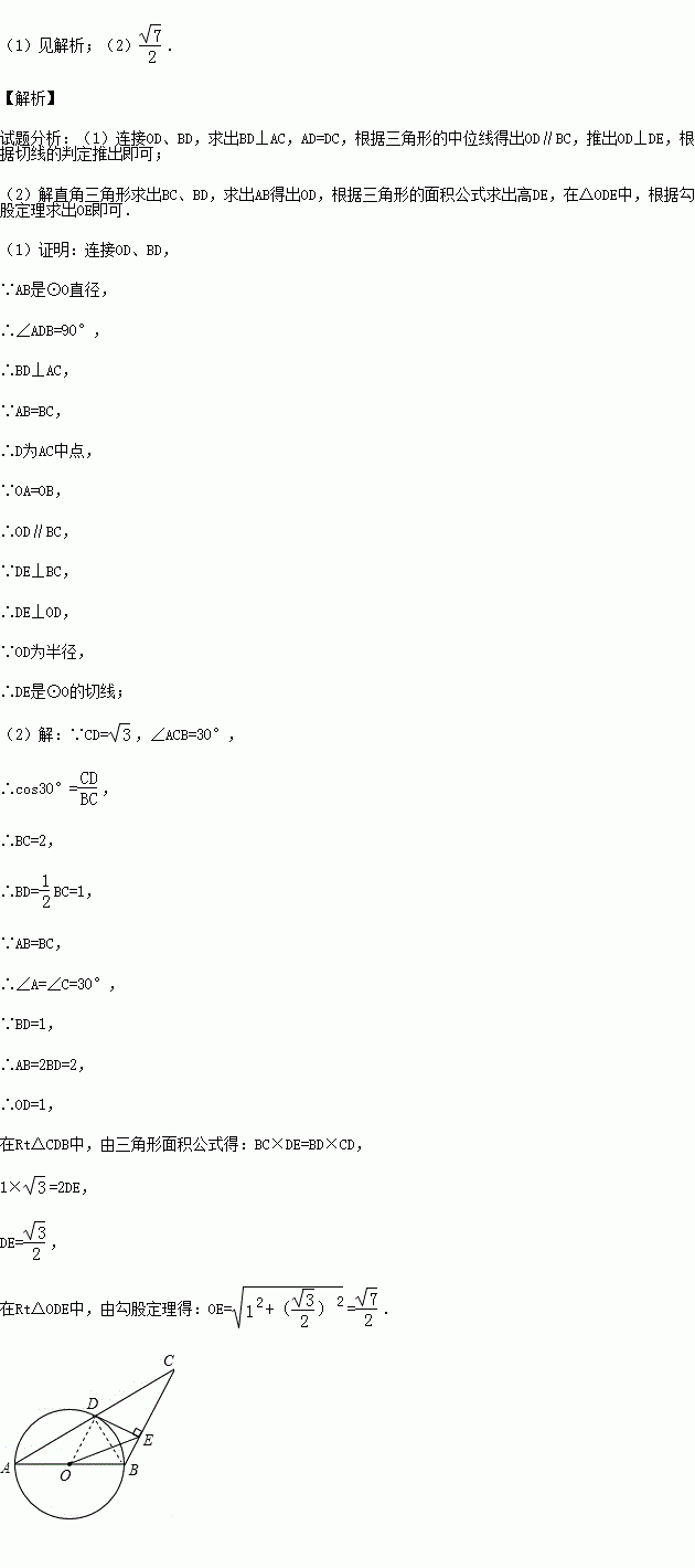 (2015秋•滦县期末)如图,已知△ABC中,AB=BC,以AB为直径的圆O交AC于点D,过点D作DE⊥BC,垂足为E,连接OE.