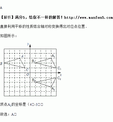 如图,△ABC在平面直角坐标系中第二象限内,顶点A的坐标是(﹣2,3),先把△ABC向右平移6个单位得到△A1B1C1,再作△A1B1C1关于x轴对称图形△A2B2C2,则顶点A2的坐标是( )
