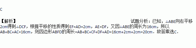 如图将△ABE向右平移2cm得到△DCF,如果△ABE的周长是16cm,那么四边形ABFD的周长是( )