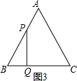 (3)分两种情况考虑:(i)当PQ⊥BC时,如图所示,由速度是1厘米/秒,时间是t秒,利用速度×时间=路程表示出AP与BQ的长,再由AB-AP表示BP,由三角形ABC为等边三角形,得到∠B=60°,在直角三角形BPQ中,利用锐角三角函数定义及特殊角的三角函数值列出关于t的方程,求出方程的解即可得到t的值;(ii)当QP⊥AB时,如图所示,由速度是1厘米/秒,时间是t秒,利用速度×时间=路程表示出AP与BQ的长,再由AB-AP表示BP,由三角形ABC为等边三角形,得到∠B=60°,在直角三角形BPQ中,利用锐角三角函数定义及特殊角的三角函数值列出关于t的方程,求出方程的解即可得到t的值,综上,得到所有满足题意的t的值.