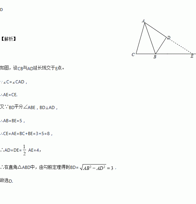 如图,D为△ABC外一点,BD⊥AD,BD平分△ABC的一个外角,∠C=∠CAD,若AB=5,BC=3,则BD的长为( )