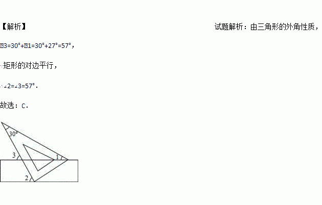 如图,将一块含有30°角的直角三角板的两个顶点叠放在矩形的两条对边上,如果∠1=27°,那么∠2的度数为( )