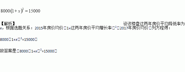 某楼盘2015年房价均价为每平方米8000元,经过两年连续涨价后,2017年房价均价为15000元.设该楼盘这两年房价平均增长率为x,根据题意可列方程为______.