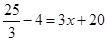 把m=代入方程5m-4=3x+20得: