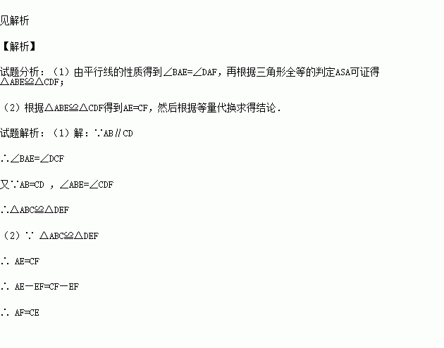 (6分)如图,四边形ABCD中,AB∥CD,AB=CD,A、F、E、C在同一直线上,