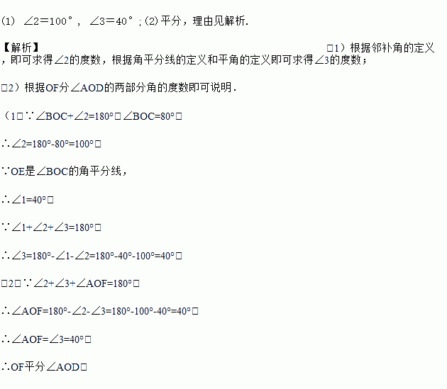 如图,直线AB,CD交于点O,且∠BOC=80°,OE平分∠BOC,OF为OE的反向延长线.