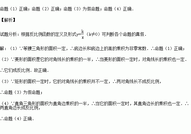 (2016春•德州校级月考)给出下列四个关于是否成反比例的命题,判断它们的真假.