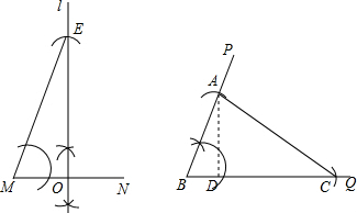 分析:(1)画线段MN,作MN的中垂线l,垂足为O,以M为圆心,3MO为半径画弧,交l于点E,则∠EMO为∠β;