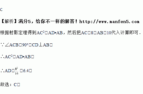 如图,Rt△ABC中,∠ACB=90°,CD⊥AB , AC=8,AB=10,则AD等于( )