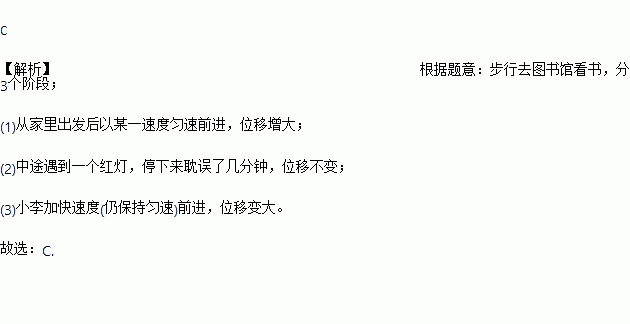 某星期天小李步行取图书馆看书,途中遇到一个红灯,停下来耽误了几分钟,为了赶时间,他以更快速度步行到图书馆,下面几幅图是步行路程s(米)与行进时间t(分)的关系的示意图,你认为正确的是( )