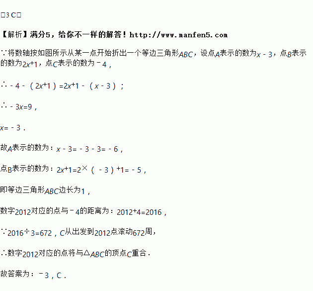 将数轴按如图所示从某一点开始折出一个等边三角形ABC,设点A表示的数为x﹣3,点B表示的数为2x+1,点C表示的数为﹣4,若将△ABC向右滚动,则x的值等于_____,数字2012对应的点将与△ABC的顶点_____重合.