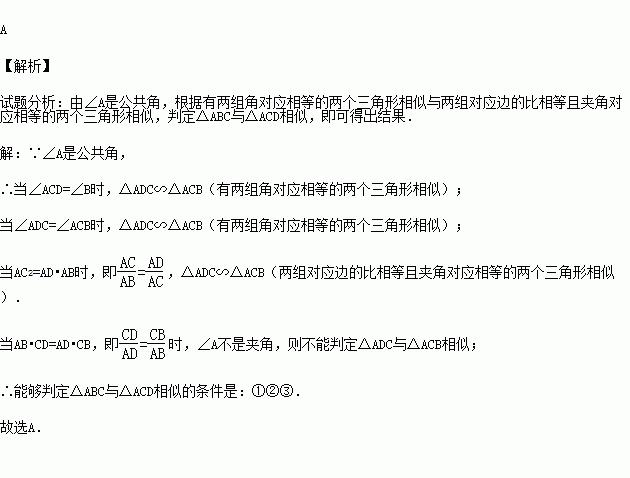 (2015秋•简阳市期末)如图,在△ABC中,点D在AB上,在下列四个条件中:①∠ACD=∠B;②∠ADC=∠ACB;③AC2=AD•AB;④AB•CD=AD•CB,能满足△ADC与△ACB相似的条件是( )