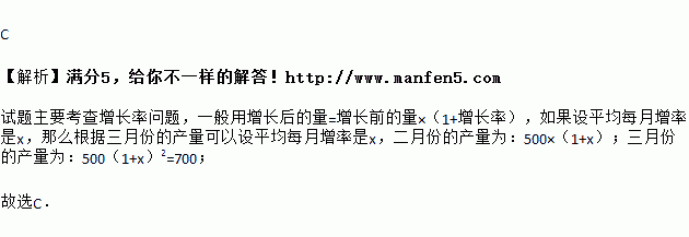 某厂一月份的总产量为500吨,三月份的总产量达到为700吨.若平均每月增长率是x,则可以列方程( )