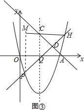 (3)①过点C作CH∥x轴交直线PQ于点H,可得△CHQ是等腰三角形,进而得出AD⊥PH,得出DQ=DH,从而得出PD+DQ=PH,过P点作PM⊥CH于点M,则△PMH是等腰直角三角形,得出PH=$\sqrt{2}$PM,因为当PM最大时,PH最大,通过求得PM的最大值,从而求得PH的最大值;由①可知:PD+PH≤6$\sqrt{2}$,设PD=a,则DQ$≤6\sqrt{2}$-a,得出PD•DQ≤a(6$\sqrt{2}$-a)=-a2+6$\sqrt{2}$a=-(a-3$\sqrt{2}$)2+18,当点P在抛物线的顶点时,a=3$\sqrt{2}$,得出PD•DQ≤18.