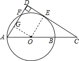 分析 过O作OG⊥AD于G,连接OE,由CD是⊙O的切线,得到OE⊥CD,推出四边形OEDG是矩形,根据矩形的性质得到DG=OE=3cm,DE=OG,由垂径定理得到AG=FG,根据勾股定理得到OG=$\sqrt{A{O}^{2}-A{G}^{2}}$=$\sqrt{5}$,于是得到结论.