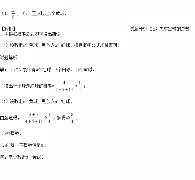 (2)现从袋中取走若干个黄球,并放入相同数量的红球,搅拌均匀后,要使从袋中摸出一个球是红球的概率不小于