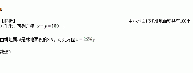为保护生态环境,南充市响应国家“退耕还林”号召,将某一部分耕地改为林地,改变后,林地面积和耕地面积共有180平方千米,耕地面积是林地面积的25%,为求改变后林地面积和耕地面积各多少平方千米。设改变后耕地面积x平方千米,林地地面积y平方千米,根据题意,列出如下四个方程组,其中正确的是( )