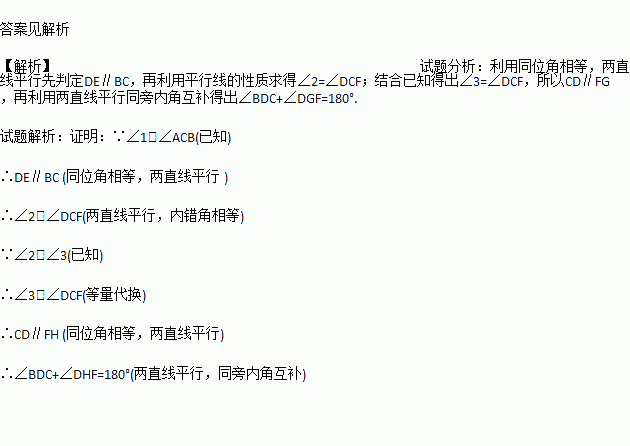 已知,如图,∠1=∠ACB,∠2=∠3,求证:∠BDC+∠DHF=180°