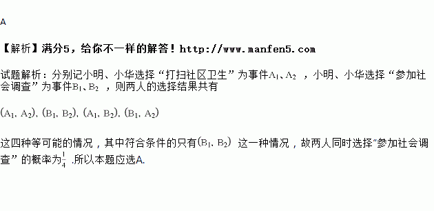 小明和小华参加社会实践活动,随机选择“打扫社区卫生”和“参加社会调查”其中一项,那么两人同时选择“参加社会调查”的概率为( )