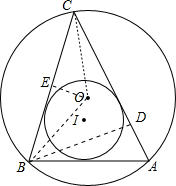 分析 作BD⊥AC于D,连结OB、OC,作OE⊥BC于E,如图,在Rt△ABD中利用含30度的直角三角形三边的关系得AD=$\frac{1}{2}$AB=3,BD=$\sqrt{3}$AD=3$\sqrt{3}$,则CD=AC-AD=5,再在Rt△BCD中利用勾股定理计算出BC=2$\sqrt{13}$,接着利用垂径定理,由OE⊥BC得BE=CE=$\frac{1}{2}$BC=$\sqrt{13}$,∠BOE=∠COE,然后根据圆周角定理得∠∠BOE=∠A=60°,于是在Rt△BOE中,根据正弦的定义可计算出BO=$\frac{2\sqrt{39}}{3}$,即外接圆⊙O的半径为$\frac{2\sqrt{39}}{3}$;设△ABC的内切圆⊙I的半径为r,根据三角形面积公式得到$\frac{1}{2}$r•(AB+BC+AC)=$\frac{1}{2}$BD•AC,即可计算出r=$\frac{7\sqrt{3}-\sqrt{39}}{3}$.