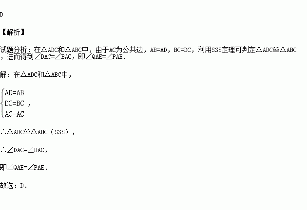 (2015•义乌市)如图,小敏做了一个角平分仪ABCD,其中AB=AD,BC=DC.将仪器上的点A与∠PRQ的顶点R重合,调整AB和AD,使它们分别落在角的两边上,过点A,C画一条射线AE,AE就是∠PRQ的平分线.此角平分仪的画图原理是:根据仪器结构,可得△ABC≌△ADC,这样就有∠QAE=∠PAE.则说明这两个三角形全等的依据是( )