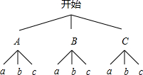 (2)首先分别用A,B,C表示第一道单选题的3个选项,a,b,c表示剩下的第二道单选题的3个选项,然后画出树状图,再由树状图求得所有等可能的结果与小明顺利通关的情况,继而利用概率公式即可求得答案;