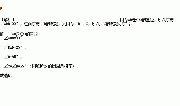 已知,如图,AB是⊙O的直径,点D,C在⊙O上,连接AD、BD、DC、AC,如果∠BAD=25°,那么∠C的度数是( )