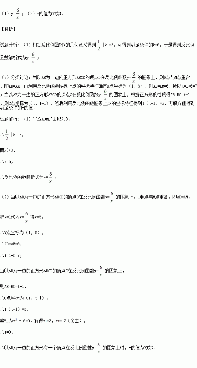 (2)设点B的坐标为(t,0),其中t>1.若以AB为一边的正方形有一个顶点在反比例函数