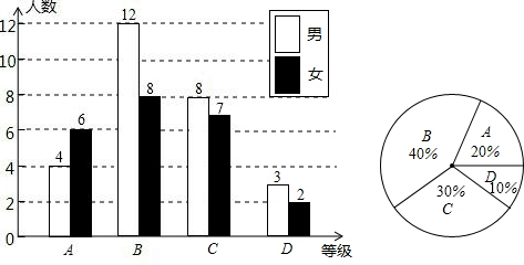 ÔòµÈ¼¶AµÄѧÉúÊýΪ50¡Á20%=10£¨ÈË£©£¬¼´µÈ¼¶AÄÐÉúΪ4ÈË£»