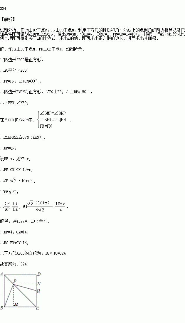 如图,正方形ABCD,点P是对角线AC上一点,连结BP,过P作PQ⊥BP,PQ交CD于Q,若AP=4