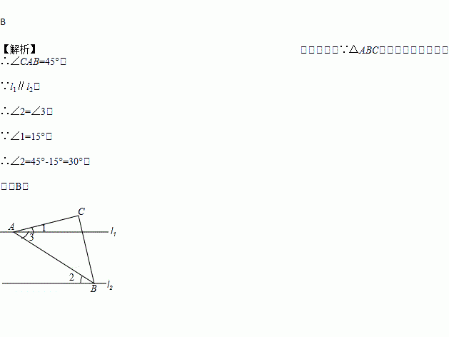 如图,直线l1∥l2,等腰直角△ABC的两个顶点A、B分别落在直线l1、l2上,∠ACB=90°,若∠1=15°,则∠2的度数是( )