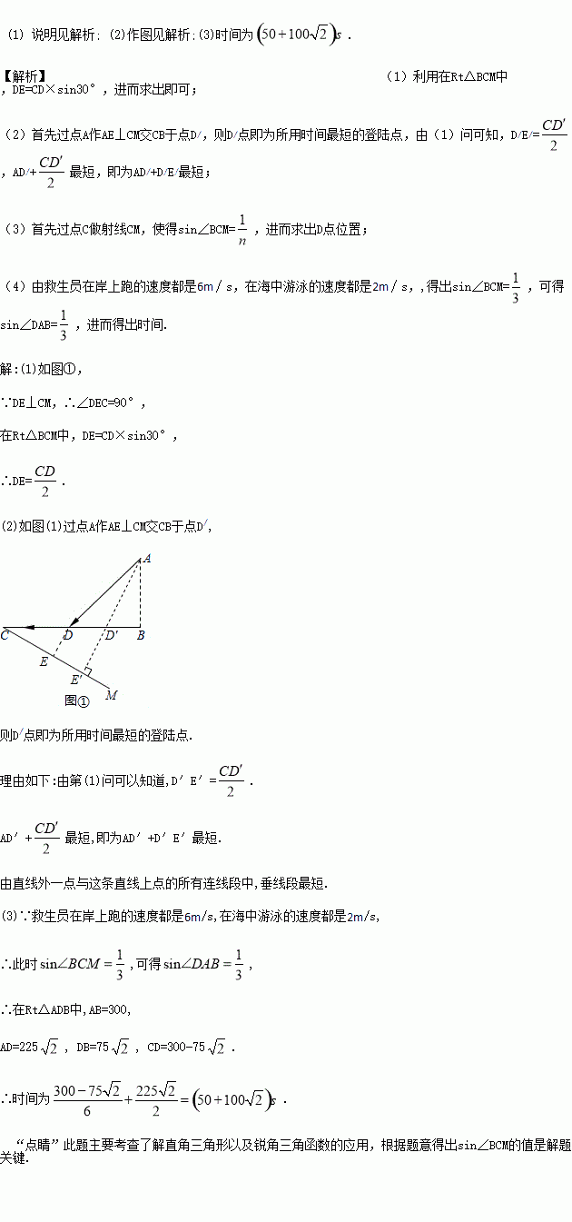 (3)如图(3),海面上一标志A到海岸BC的距离AB=300m,BC=300m.救生员在C点处发现标志A处有人求救,立刻前去营救,若救生员在岸上跑的速度都是