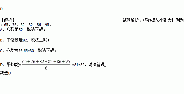 在一次数学测试中,某学习小组6名同学的成绩(单位:分)分别为65,82,86,82,76,95.关于这组数据,下列说法错误的是( )