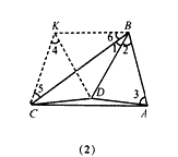 | (2)猜想:∠DBC与∠ABC度数的比值与(1)中结论相同, 证明:如图(2),作∠KCA= ∠BAC, 过B点作BK//AC交CK于点K,连接DK, ∵∠BAC≠90°, ∴四边形ABKC是等腰梯形, ∴CK=AB, ∵DC=DA, ∴∠DCA=∠DAC, ∵∠KCA=∠BAC, ∴∠KCD=∠3, ∴△KCD≌△BAD, ∴∠2=∠4,KD= BD, ∴KD=BD=BA=KC, ∵BK//AC, ∴∠ACB=∠6, ∵∠KCA=2∠ACB, ∴∠5=∠ACB, ∴∠5=∠6, ∴KC=KB, ∴KD=BD=KB, ∴∠KBD=60°, ∵∠ACB=∠6=60°- ∠l, ∴∠BAC=2∠ACB=120°-2∠1, ∵∠l+(60°-∠l)+(120°-2∠1)+∠2 =180°, ∴∠2=2∠1, ∴∠DBC与∠ABC度数的比值为1/3。 |