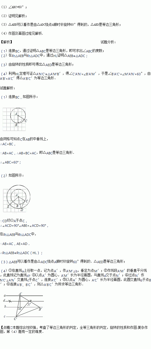 (4)如图(3),已知直线a,b,c,且a∥b,b∥c,在图中用直尺、三角板、圆规画等边三角形A′B′C′使三个顶点A′,B′,C′,分别在直线a,b,c上.要求写出简要的画图过程,不需要说明理由.