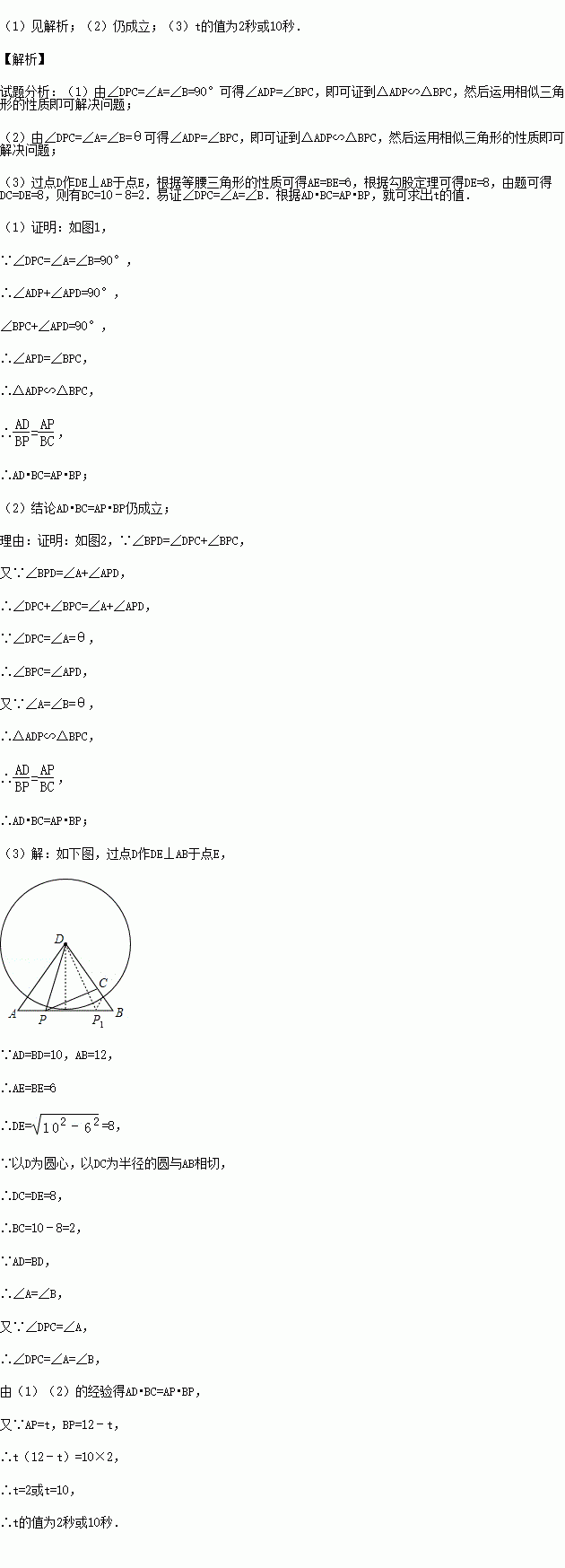 如图3,在△ABD中,AB=12,AD=BD=10.点P以每秒1个单位长度的速度,由点A出发,沿边AB向点B运动,且满足∠DPC=∠A.设点P的运动时间为t(秒),当以D为圆心,以DC为半径的圆与AB相切,求t的值.