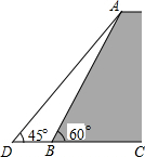 17.如图,一堤坝的坡角∠ABC=60°,坡面长度AB=30米(图为横截面),为了使堤坝更加牢固,一施工队欲改变堤坝的坡面,使得坡面的坡角∠ADB=45°,则此时应将坝底向外拓宽多少米?(结果保留到0.1米)(参考数据:$\sqrt{2}$≈1.414,$\sqrt{3}$≈1.732)