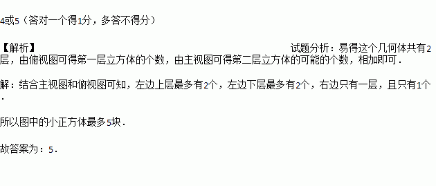 由若干个相同的小正方体搭成的一个几何体的主视图和俯视图如图所示,则组成这个几何体的小正方体的个数最多有
