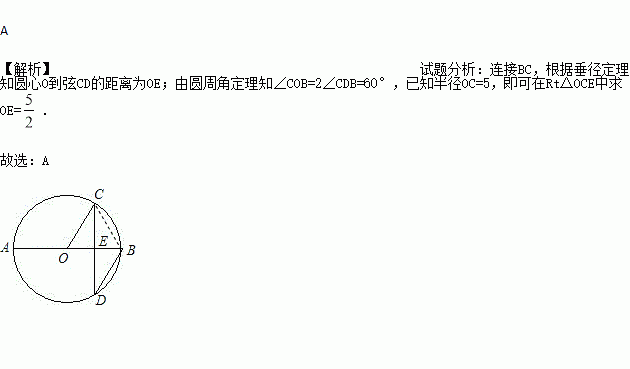 如图,AB是⊙O的直径,弦CD⊥AB于点E,∠CDB=30°,⊙O的半径为5cm,则圆心O到CD的距离为( )
