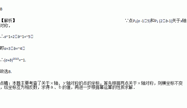 已知点P1(a -1,5)和P2 (2,b-1)关于x 轴对称,则(a+b)2013的值为( )
