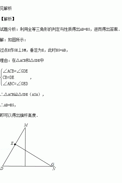 (2015秋•南京期中)八年级某班数学实验课安排测量操场上旗杆的高度.小聪同学经过认真思考,研究出了一个可行的测量方案:在某一时刻测得旗杆AB的影长BC和∠ACB的大小,然后在操场上画∠MDN,使得∠MDN=∠ACB,在边DM上截取线段DE=BC,再利用三角形全等的知识求出旗杆的高度,请完成小聪同学的测量方案,并把图形补画完整,说明方案可行的理由.