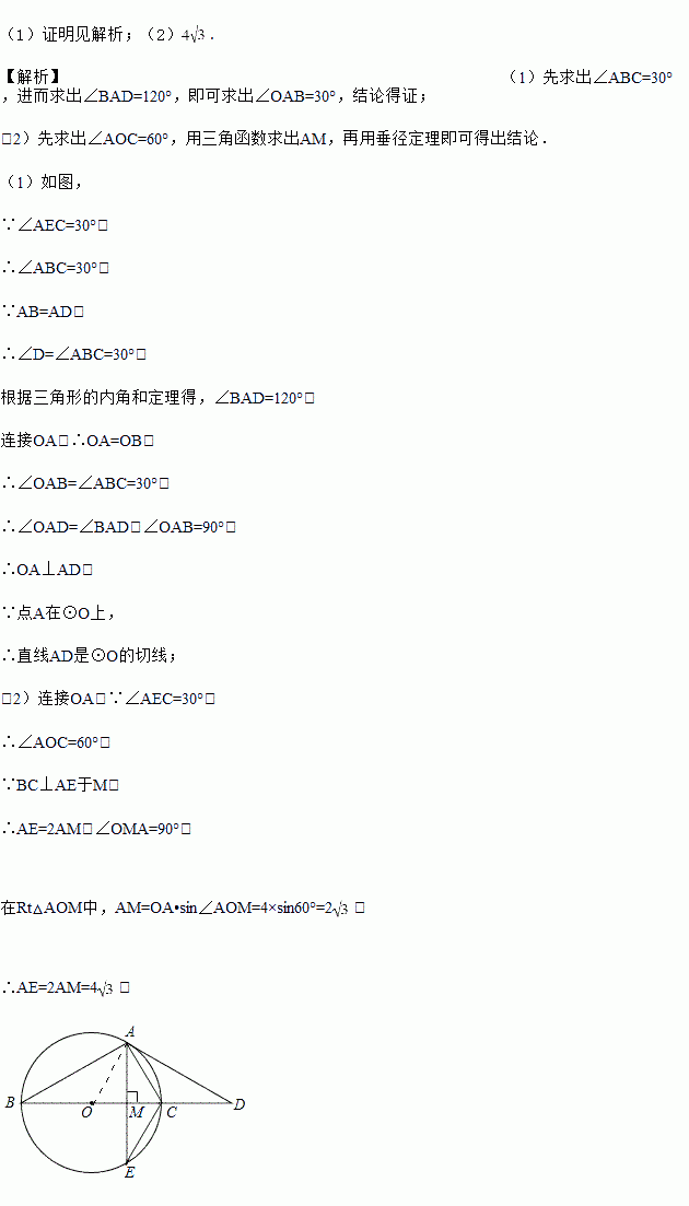 已知BC是⊙O的直径,点D是BC延长线上一点,AB=AD,AE是⊙O的弦,∠AEC=30°.