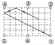 如图是一台球桌面示意图,图中小正方形的边长均相等,黑球放在如图所示的位置,经白球撞击后沿箭头方向运动,经桌边反弹最后进入球洞的序号是 ( )